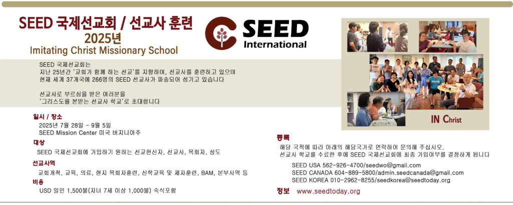 - 선교 전략: SEED 선교회는 교회를 기반으로 한 후원을 통해 사역하며, 선교하는 교회가 성장 한다는 신념으로 선교의 중요성을 강조합니다.