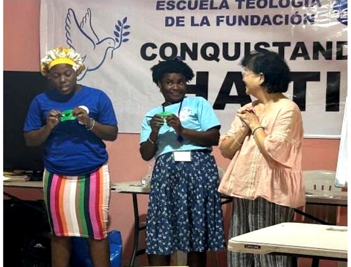 신학생들에게 그림 설교자료, 성막 교구, 크리올어 성경, 노트, 개인 용품, 검정 가방, 6개의 백팩, 2종류의 티셔츠, 성경 지지대, 선물 꾸러미와 다수의 상품과 선물도 나누어주었습니다.