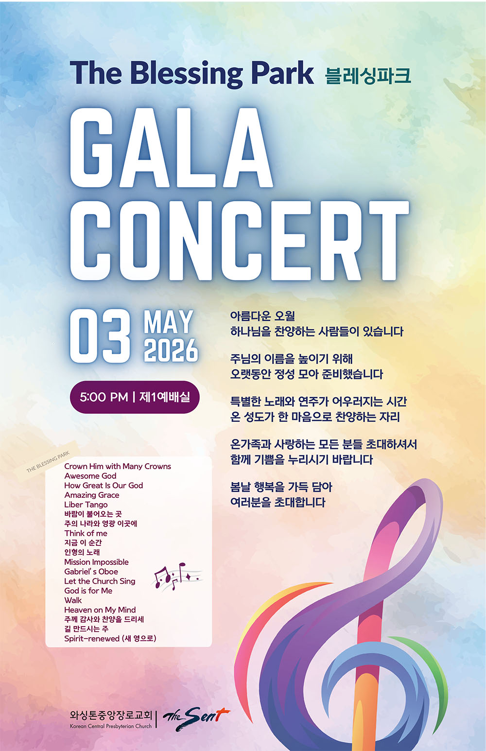 봄의 향기가 가득한 5월의 저녁, 아름다운 음악으로 하나 되어 하나님께 감사와 찬양을 올려드립니다. 다음 세대를 위한 믿음의 터전이자 교회와 지역을 잇는 열린 축복의 공간, 블레싱파크를 소망하며 갈라 콘서트를 준비하였습니다.