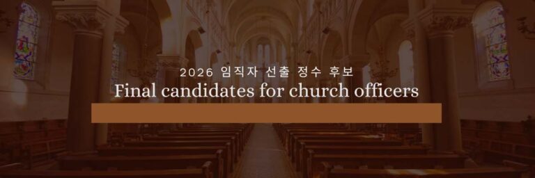 Final candidates for church officers 임직자 선출을 위한 임시 공동의회에 상정할 정수 후보는 아래와 같습니다.The candidates to be presented to the Special Congregational Meeting for the election of church officers are as follows: 장로 후보 Elder candidates: 김기원3, 김종준, 서진우, 한종건…